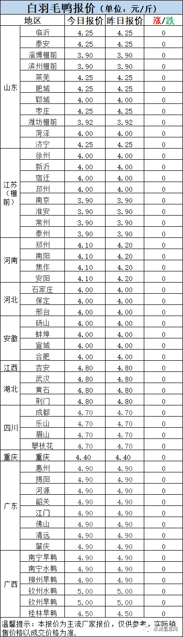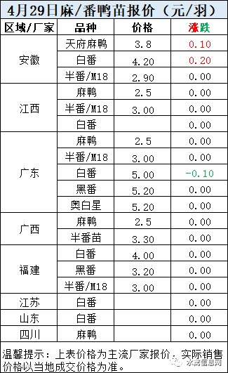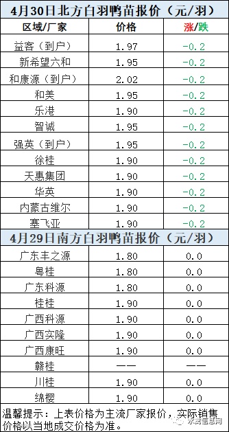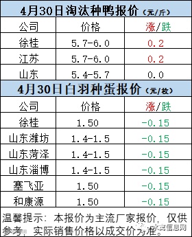 一、4月29日晚至4月30日 白羽肉鸭报价
