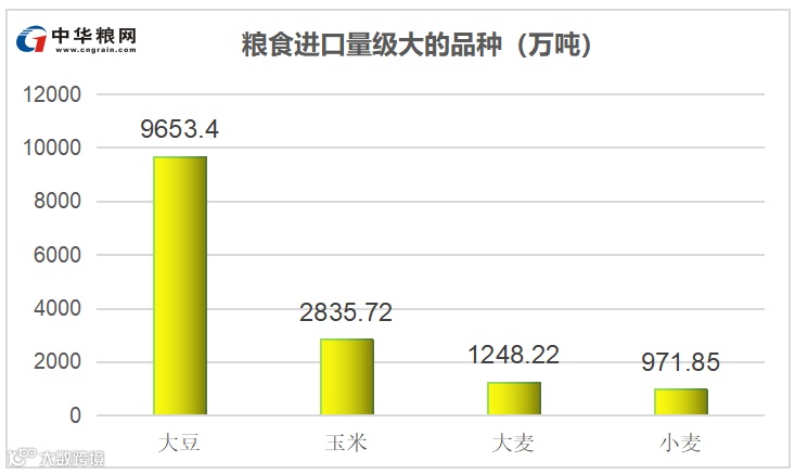 2021年我国进口粮食16453.9万吨,接近全年粮食产量的四分之一。其中饲料粮进口比较大,进口量接近或超过千万吨的依次是大豆、玉米、大麦和小麦四个品种。