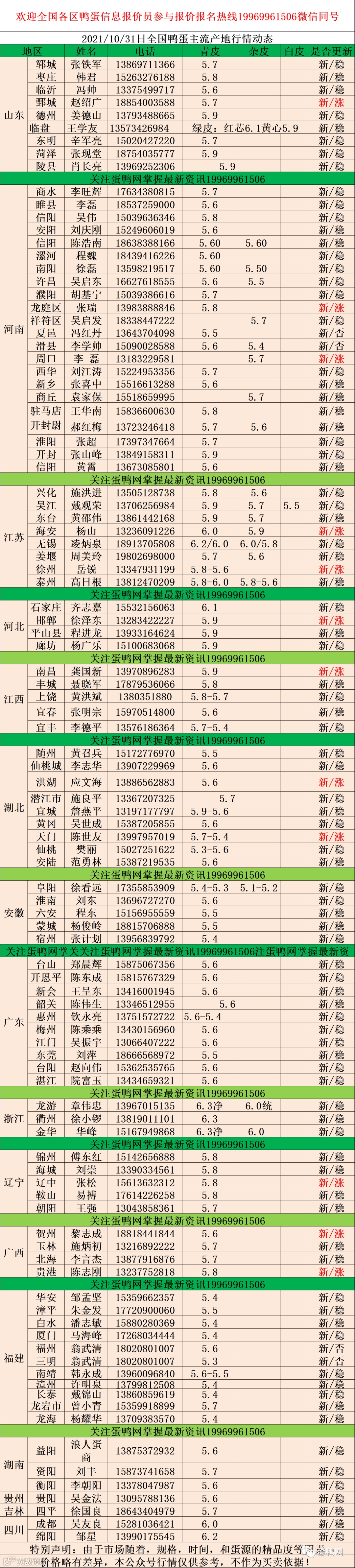 2021年10月31日鲜鸭蛋价格:初产至10个头5.4元 。 10个头至大蛋5.8(鸭蛋价格仅供参考)。