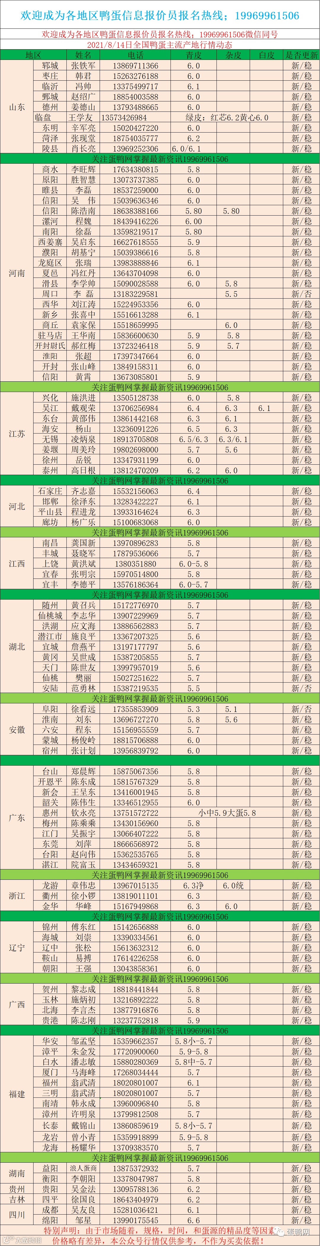 2021年8月14日鲜鸭蛋价格:初产至10个头5.2 10个至9个头5.6 ,9个至大蛋6.0。