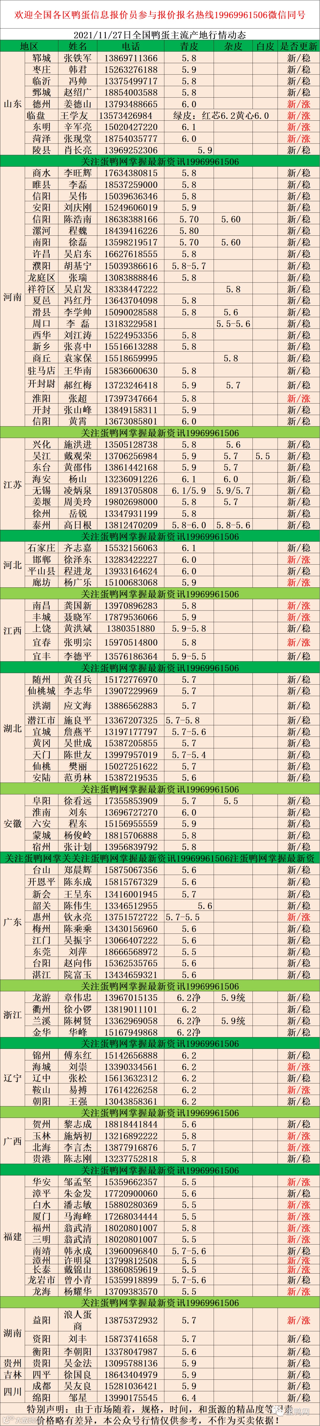 2021年11月27日鲜鸭蛋价格:初产至10个头5.6元 。 10个头至9个5.8元。9个至8个6.0元。8个至大蛋6.2元(鸭蛋价格仅供参考)。