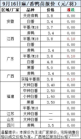 一、9月16日白羽鸭苗报价