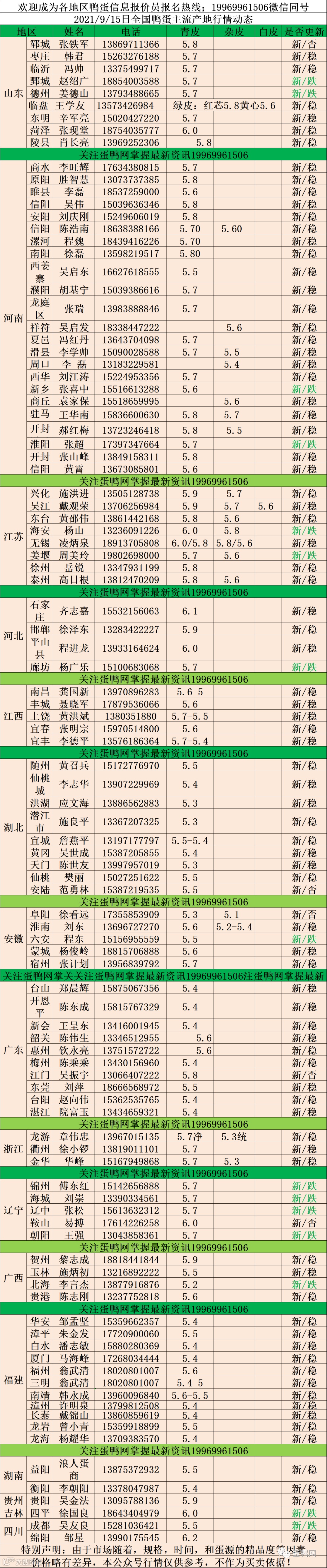 2021年9月15日鲜鸭蛋价格:初产至10个头5.2 元 10个至9个头5.6 元,9个至大蛋5.7元(鸭蛋价格仅供参考)。