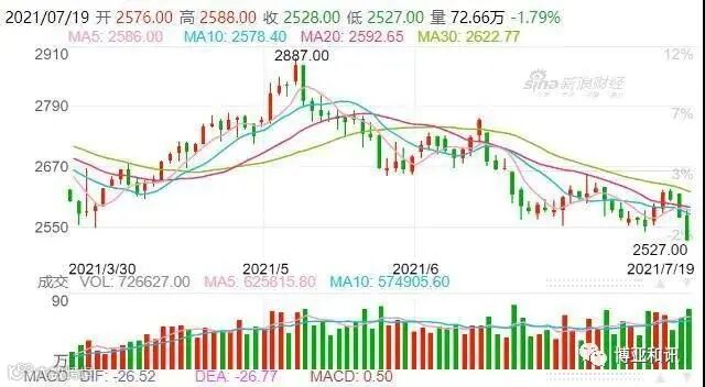 受企业收购价格大幅下调,今日大连玉米09主力合约开盘后直线下跌37元,低价降至2527元/吨,刷新年内新低。收于2528元/吨,较上周五收盘价下降2%,下跌46元。