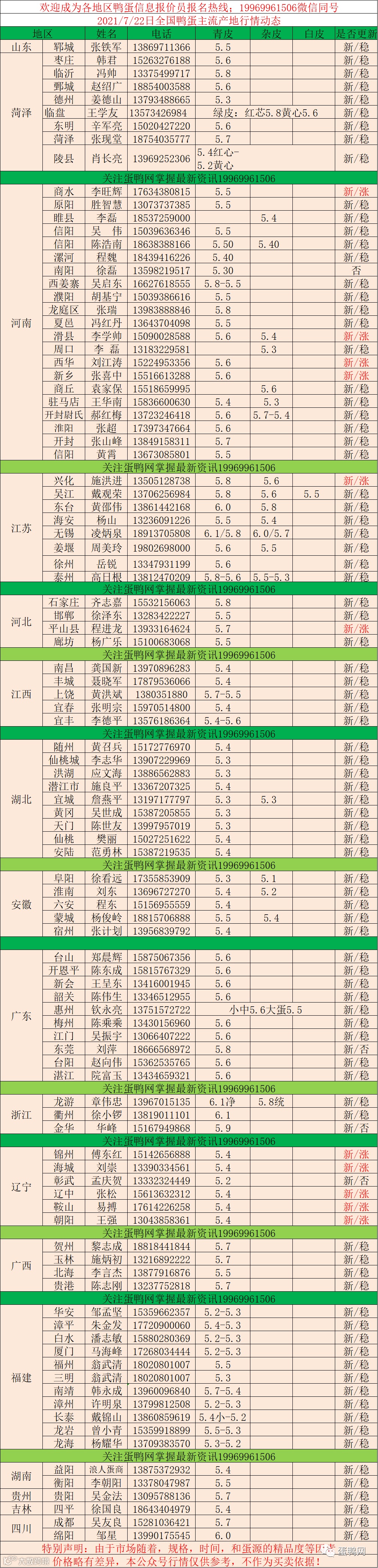2021年7月22日鲜鸭蛋价格:初产至大蛋5.4(鸭蛋价格仅供参考)