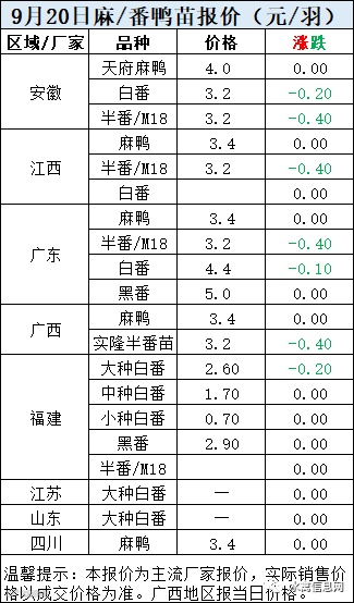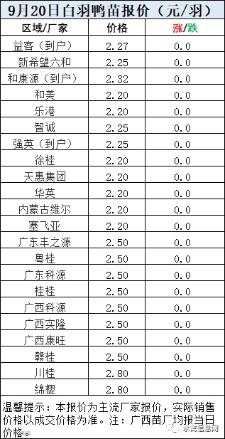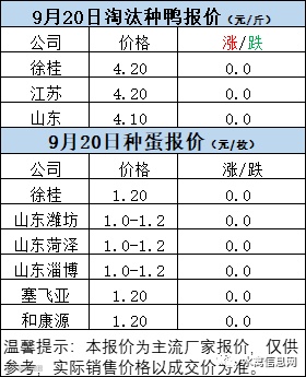 一、9月19日晚至9月20日 白羽肉鸭报价
