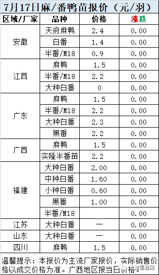 一、7月17日白羽鸭苗报价