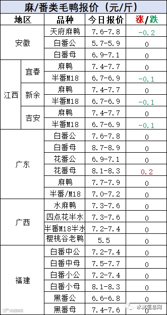 明日麻鸭苗报价川、赣继续下滑0.2元/羽,其他区域稳定。半番鸭苗报价稳定。