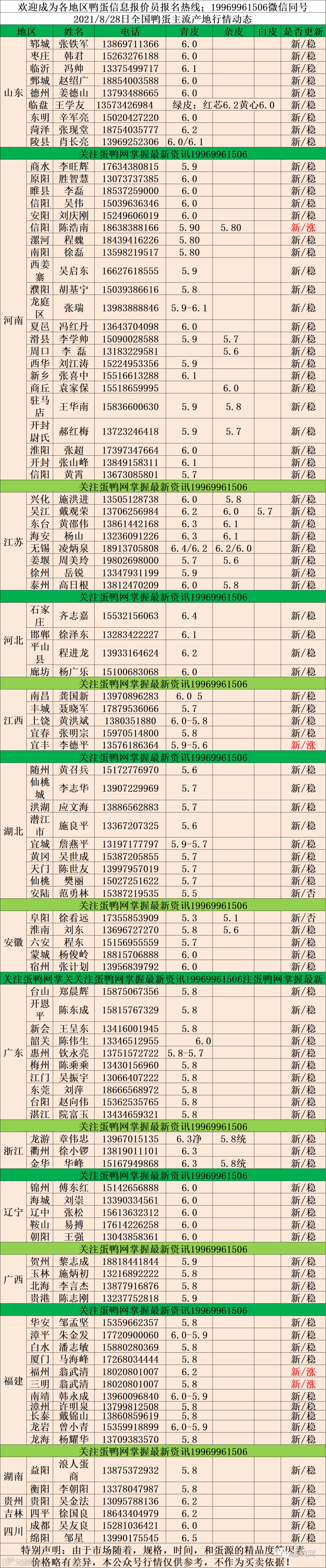 2021年8月28日鲜鸭蛋价格:初产至10个头5.2 元 10个至9个头5.6 元,9个至大蛋6.0元。