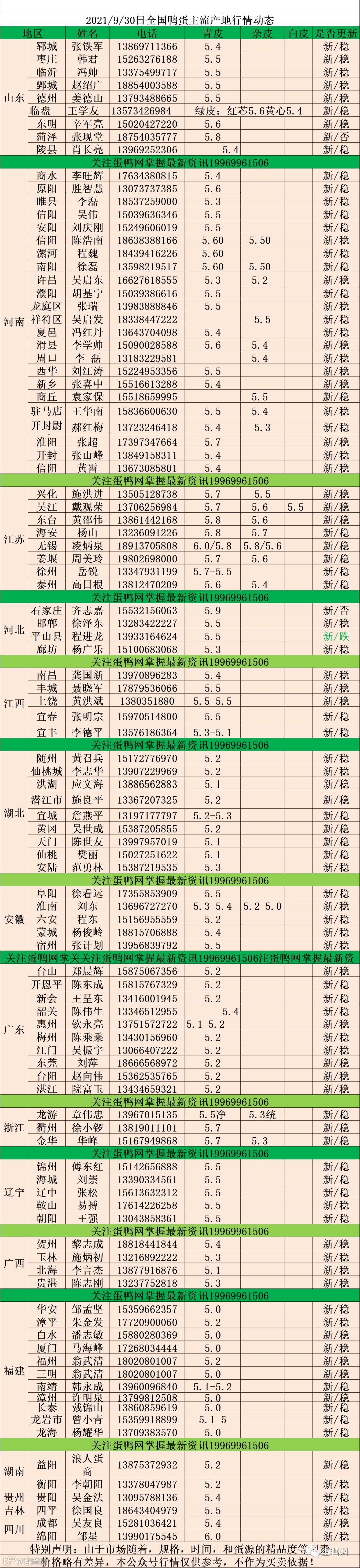 2021年9月30日鲜鸭蛋价格:初产至10个头5.0元 。 10个至9个头5.3 元, 9至8个头5.4 。8个头至大蛋5.5元(鸭蛋价格仅供参考)。