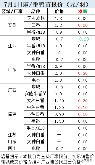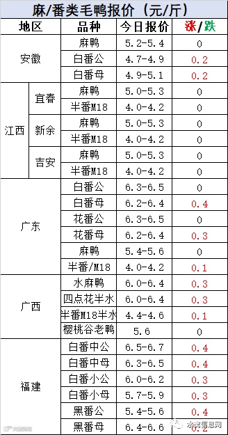 明日麻鸭苗报价整体稳定,江西下滑0.2元/羽。半番鸭苗稳定。