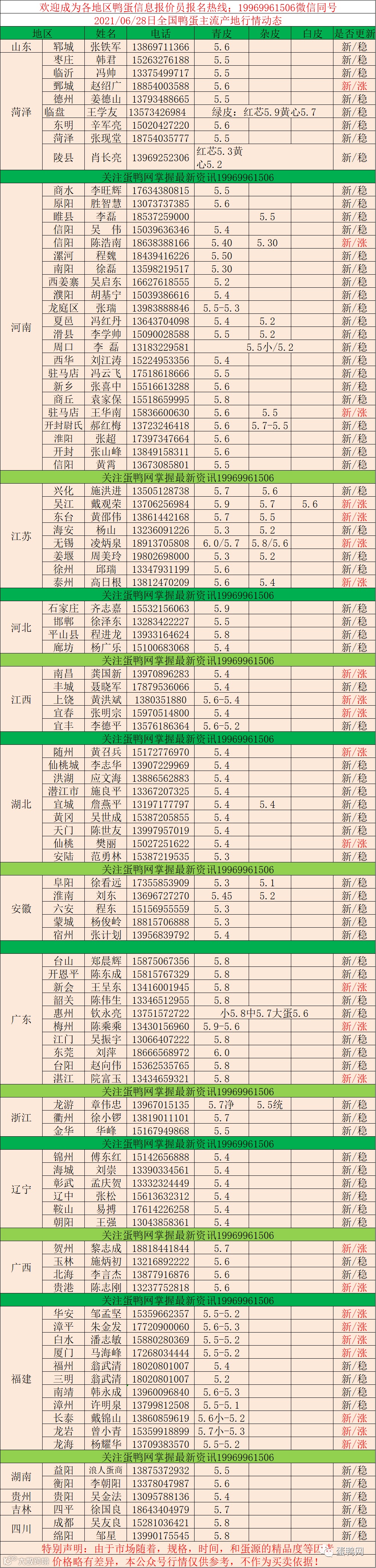 2021年6月28日鲜鸭蛋价格:初产至大蛋5.4(鸭蛋价格仅供参考)。