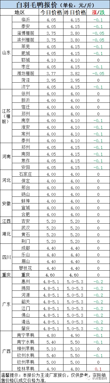 2:南方白鸭活禽报价波动调整,涨后回调,今晚报价普遍下滑0.1-0.2元/斤。