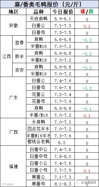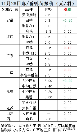 明日麻鸭苗报价,两广上涨0.2元/羽,其他区域稳定。半番鸭苗报价稳定。