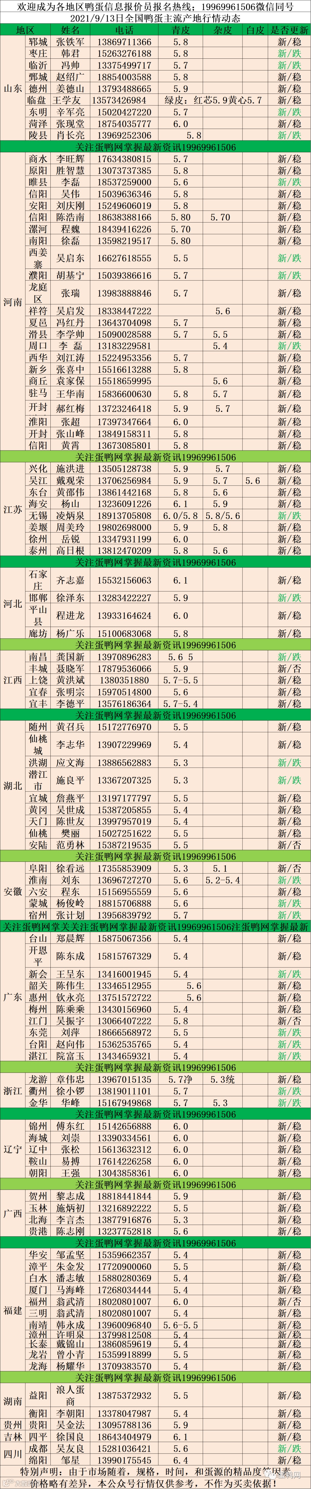 2021年9月13日鲜鸭蛋价格:初产至10个头5.2 元 10个至9个头5.6 元,9个至大蛋6.0元(鸭蛋价格仅供参考)。