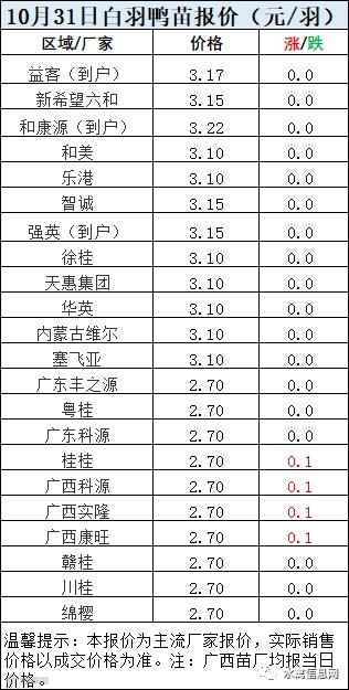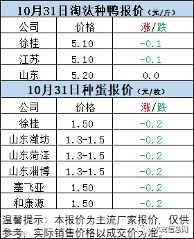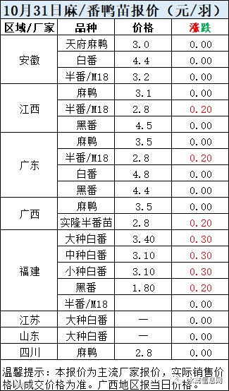 一、10月31日白羽鸭苗报价