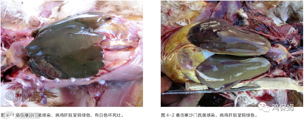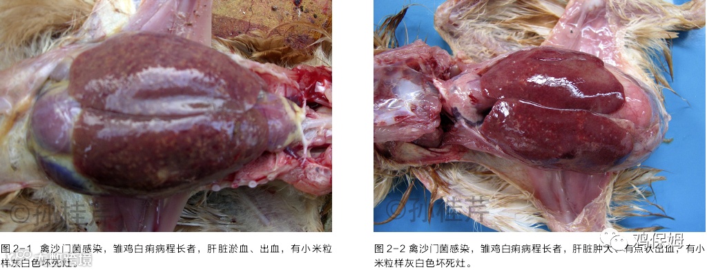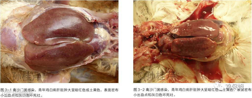 青年鸡感染沙门氏菌后,突出的变化是肝脏肿大至正常的数倍,70%-80% 的腹腔被肝脏覆盖,肝的质地极脆,一触即破,被膜上可