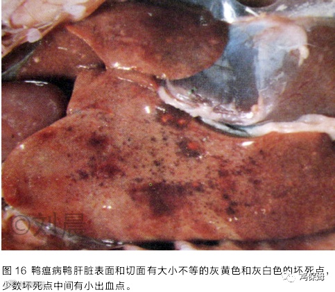 成年鸭和产蛋鸭发病死亡较为严重。病鸭流眼泪、头颈肿大,故又称大头瘟。剖检可见食道黏膜上有纵行排列的灰黄色荚膜覆盖或小出血斑点,荚膜易剥离,剥离后食管黏膜留有溃疡斑痕,泄殖腔黏膜病变与食管相同,在黏膜的表面覆盖一层灰褐色或绿色的坏死结痂,粘得很牢固,不易剥离;肝脏不肿大,肝表面和切面有大小不等的灰黄色或灰白色的坏死点,少数坏死点中间有小的出血点(图 16),这种病变具有诊断意义。