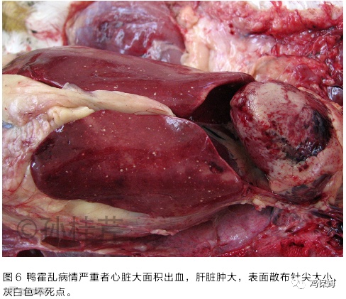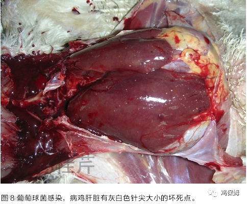 剖检可见皮下出血、溶血,脾肿大出血,或有白色坏死点,严重的脾脏实质液化,不成型。有的病例肝变脆,肝脏上有灰白色的针头大小的坏死点(图 8),该型最严重,损失最大。