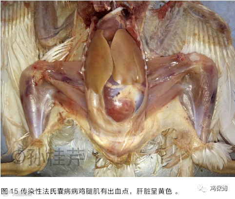 肾脏出现不同程度的肿胀,严重者呈花斑状,肾的横切面会流出白色的尿酸盐,严重者继发痛风。输尿管增粗,呈白线状。病初法氏囊出现轻微的肿胀,浆膜表面呈现黄白色胶胨样浸润,囊壁增厚,质硬,外形变圆,呈黄白色瓷器样外观;病情严重者法氏囊肿大 3-5 倍,外观颜色像“紫葡萄”样,腔上囊黏膜皱褶水肿、出血或有溃疡。未做过传染性法氏囊病疫苗免疫的鸡,或传染性法氏囊病抗体很低的鸡,易被强毒感染。可见胸肌、腿肌以及腹部肌肉严重出血时腿肌可呈现大片的黑紫色的出血区,肝脏呈黄色(图 15)。