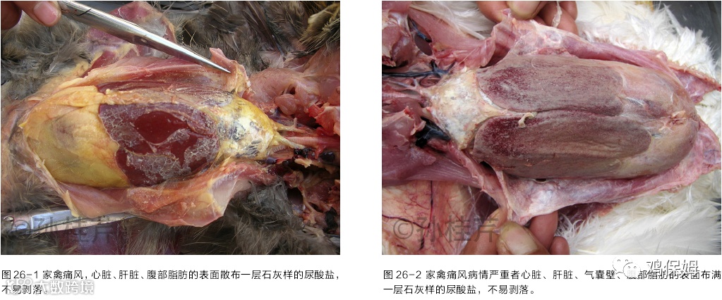 解剖可见内脏型痛风在胸、腹、气囊、肺、心包膜、肝、脾、肾、肠、及肠系膜的表面散布许多石灰样的白色尘屑样或絮状物质(图 26),输尿管增粗,内充满多量白色的黏液,病情严重者含有不规则的结石,有时可见肾脏一侧高度肿胀而另一侧萎缩。