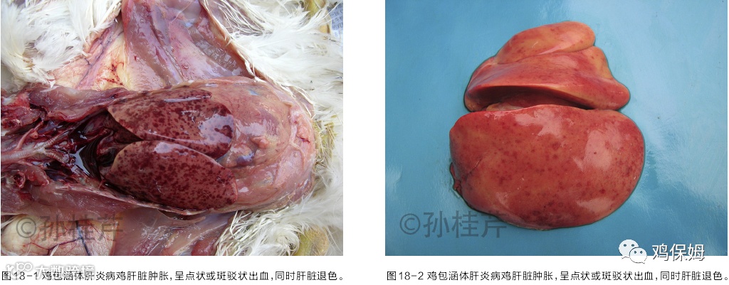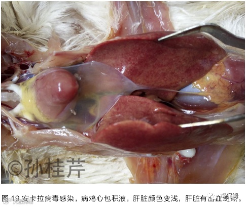 该病多发于 2-10 周龄的鸡,尤以 20 日龄左右的肉仔鸡感染率较高,死亡率在 20%~30%。该病有两个典型的特征,心包积液和肝炎(肝脏颜色变黄、肿胀、出血或肝脏点状坏死等症状)(图 19)。因首次发现于巴基斯坦卡拉奇靠近安卡拉的地方,故又名安卡拉病。本病可垂直传播,也可水平传播。
