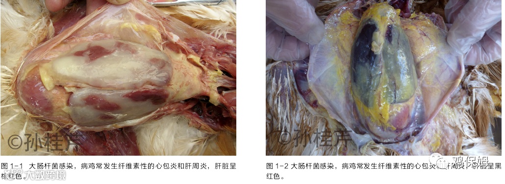 禽大肠杆菌病是由埃希氏大肠杆菌引起的多种病变的总称,该病一年四季都会发生,各种年龄的鸡均可感染,因感染的部位不同会出现十余种病理变化,如果用被感染的种蛋来孵化,多数雏鸡出壳后表现大肚与脐炎;气囊感染后使胸腹气囊壁增厚呈云雾状,严重者会继发支原体感染;腹膜感染后,造成腹膜粗糙发炎,有时可见肠粘连和卵黄性腹膜炎;如果肠系膜及肠浆膜感染后老龄鸡会在肠道浆膜及肠系膜上出现绿豆至豌豆大的结节,又称作大肠杆菌肉芽肿;输卵管感染后,常会造成输卵管和子宫发炎,产出软壳蛋、砂皮蛋、畸形蛋,蛋壳颜色变浅;最严重的感染会造成急性败血症,肝脏、心脏的周围形成一层灰白色或灰黄色纤维素性包膜,又称作包心、包肝,包膜肥厚、混浊,肝脏肿大呈棕红色或黑红色(图 1)。