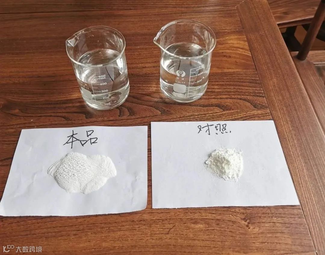 搅拌溶解5分钟后,本品与对照组溶解的情况对比