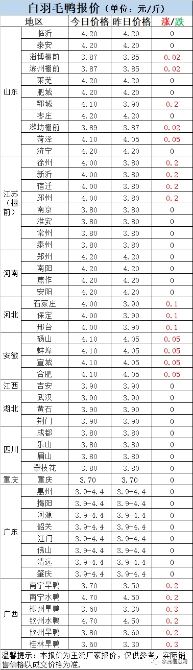 明日麻鸭苗报价稳定。半番鸭苗报价上涨0.2元/羽。