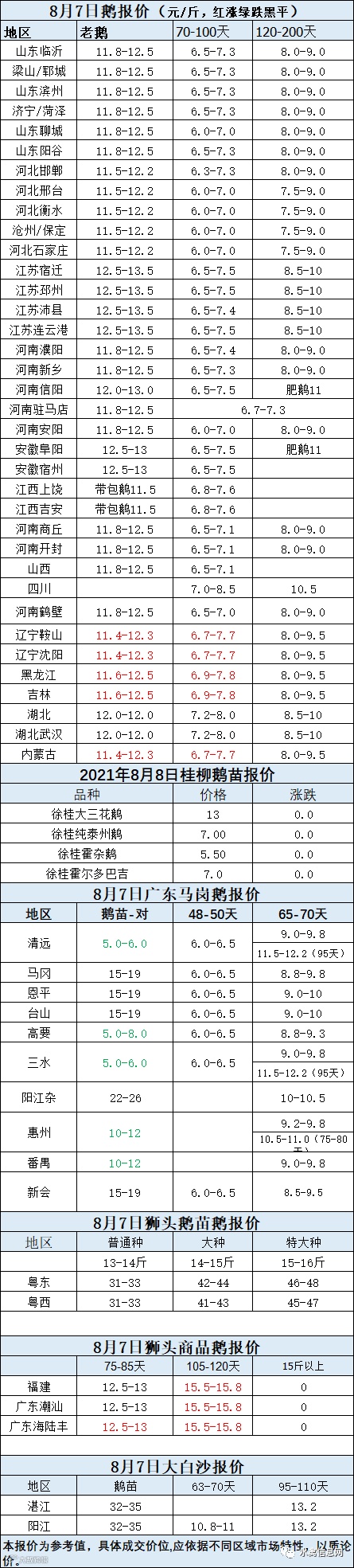 2021年8月07日鹅种蛋价格(元/枚)停报