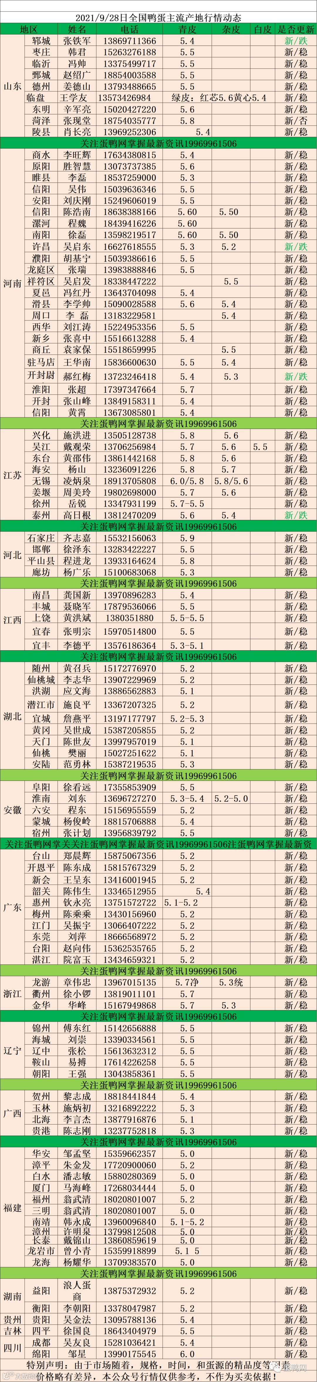 2021年9月28日鲜鸭蛋价格:初产至10个头5.0元 。 10个至9个头5.3 元, 9至8个头5.4 。8个头至大蛋5.5元(鸭蛋价格仅供参考)。