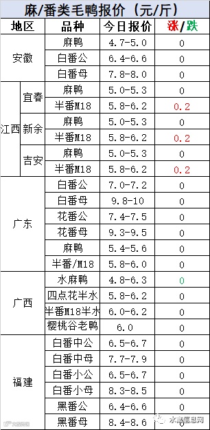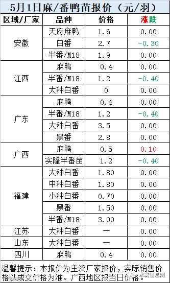 明日麻鸭苗报价稳定,广西上涨0.1元/羽。半番鸭苗报价下调0.4元/羽。