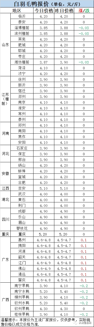 2:南方活禽区域,震荡调整。广东市场鸭止跌回涨,广西毛鸭持续追跌。