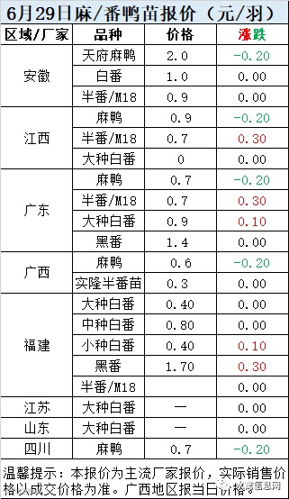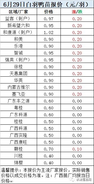 一、6月29日白羽鸭苗报价