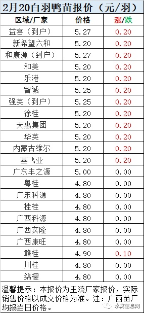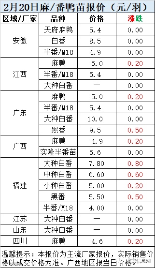 一、2月20日白羽鸭苗报价