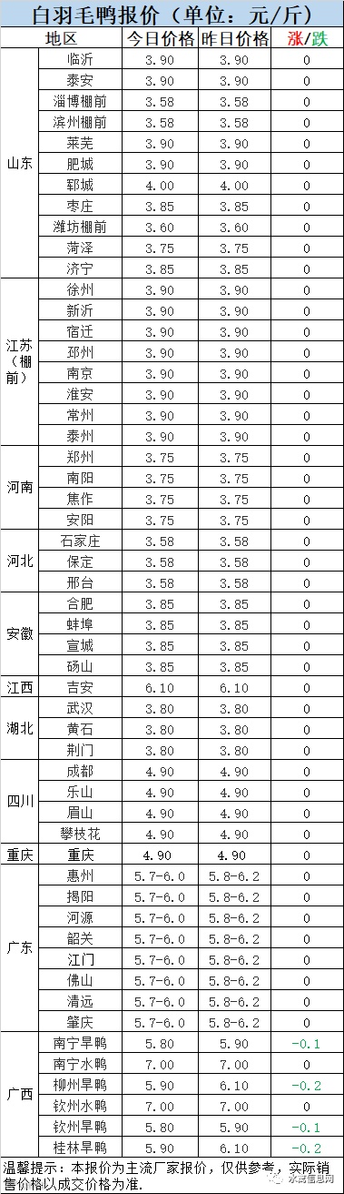 2:南方活禽区域。大厂开始收鸭,市场鸭供应亦有所增强,价格逐步走弱。今晚广西旱鸭下调明显,广东暗降。