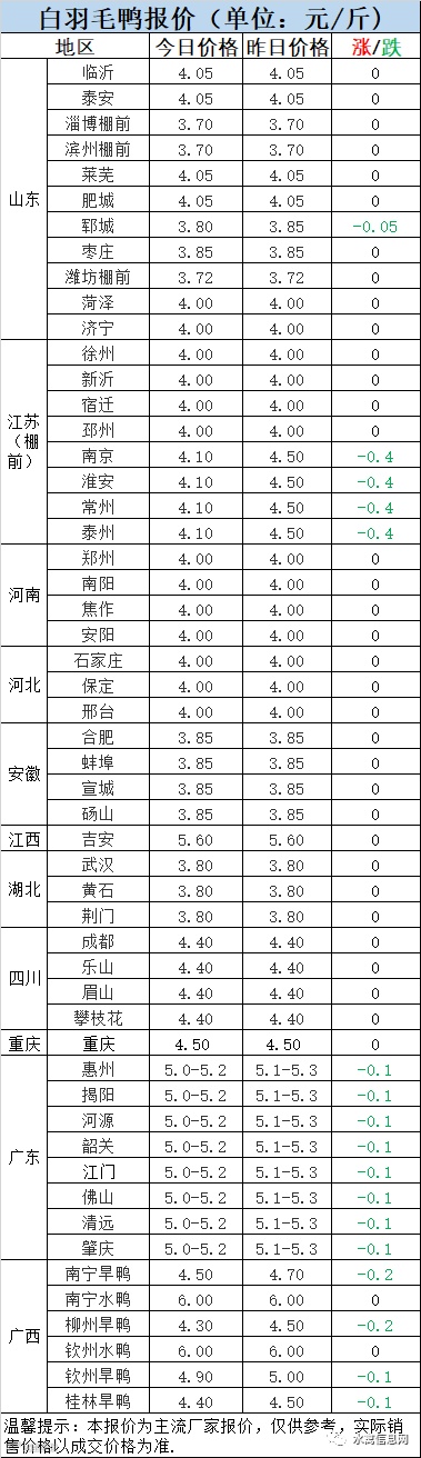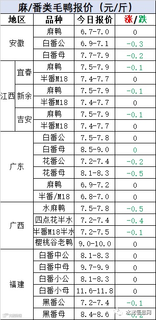 明日麻鸭苗下滑后报稳,半番鸭苗下调0.3元/羽。
