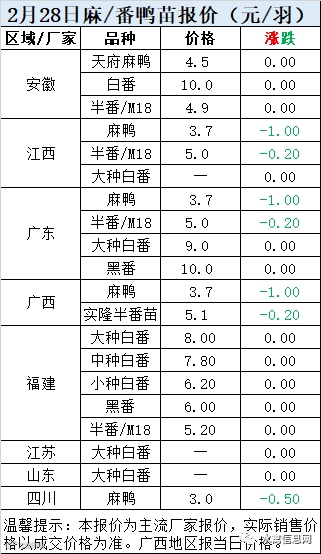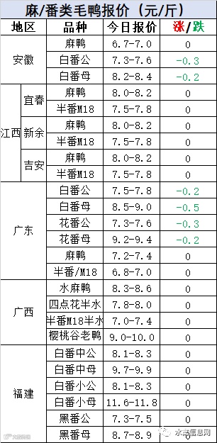 明日麻鸭苗继续下落1元/羽,半番鸭苗下调0.2元/羽。