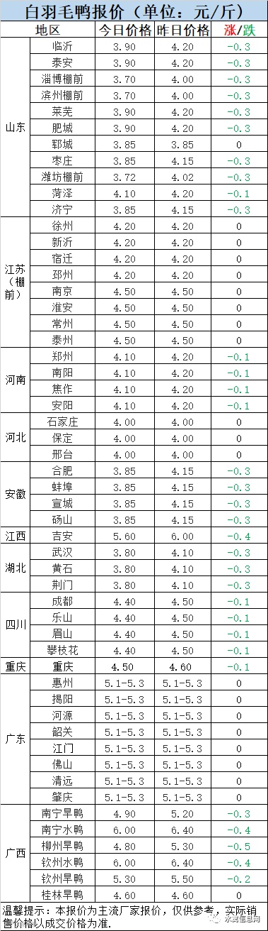 2:南方活禽区域市场报价震荡下行,节日消费势头已过,市场逐步回归平淡,近期毛鸭连续下落调整。