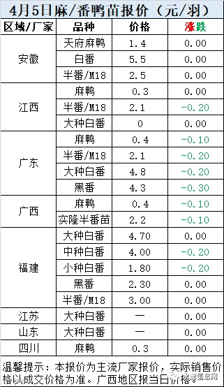 一、4月4日晚至4月5日 白羽肉鸭报价