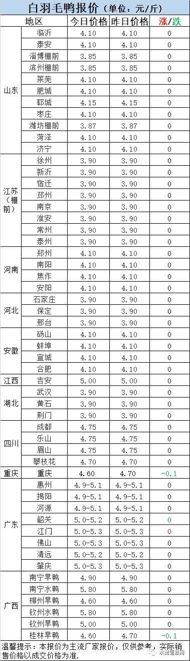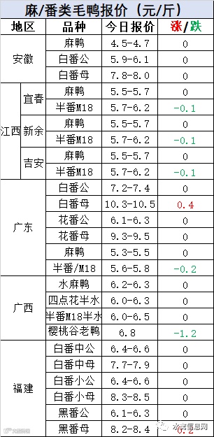 2:南方活禽区域,震荡调整。广东毛鸭今晚报价整体稳定,局部涨跌调整,广西毛鸭局部下滑。