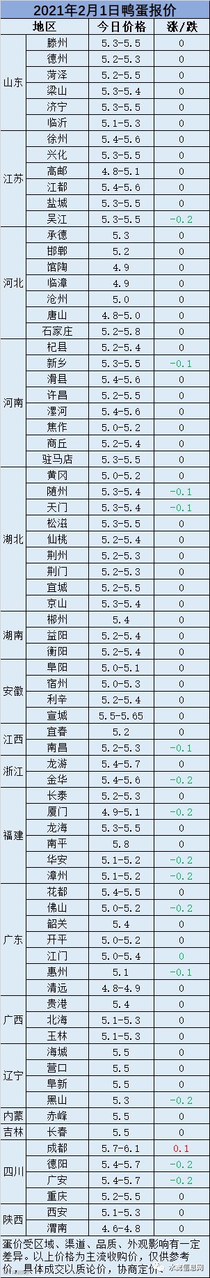 【鸭蛋价格】2021年2月1日鸭蛋报价:普遍下滑。