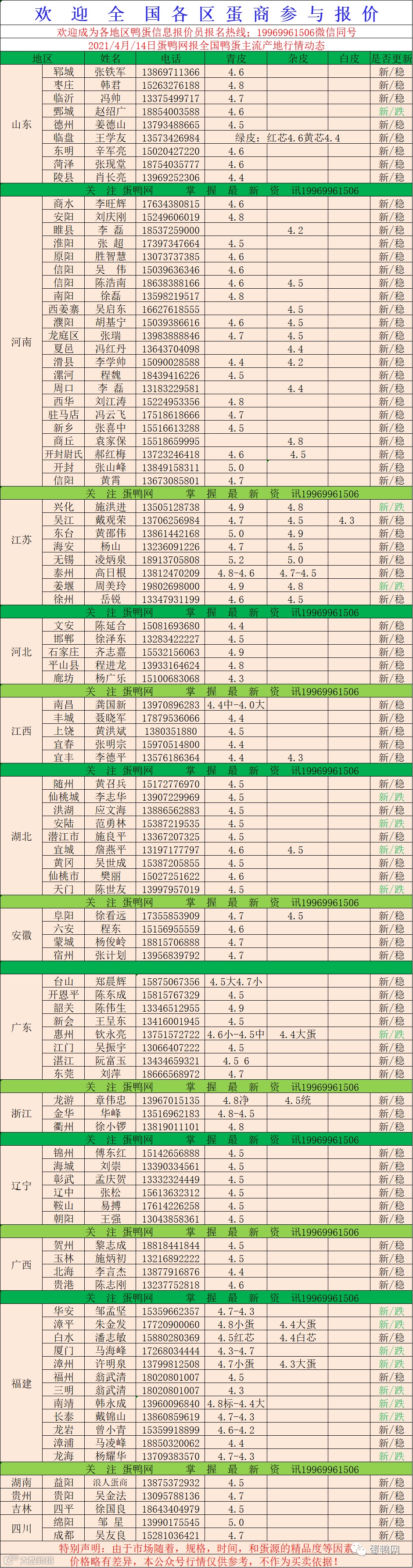 2021年4月14日鲜鸭蛋价格:初产至大蛋4.5(鸭蛋价格仅供参考)。