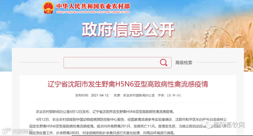 4月13日讯 据农业农村部网站消息,农业农村部新闻办公室4月12日发布,辽宁省沈阳市发生野禽H5N6亚型高致病性禽流感疫情。