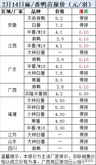 一、2月14日白羽鸭苗报价