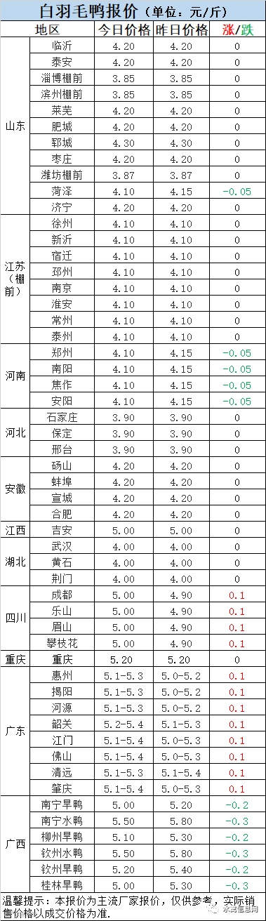 1:今晚北方分割鸭区域报价整体持稳,局部市场略又下滑。当冷藏以回收合同为主,对市场鸭收购积极性一般。北方鸭价整体处于温吞状态,冷藏库存、成本双重压力下经营压力巨大。
