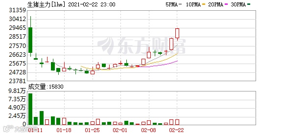 昨日国内期货市场对通胀的预期情绪加剧,大部分商品期价涨幅较大,生猪期价收盘上涨5.27%。自2月3日以来,生猪主力合约期价(收盘价)在8个交易日内(不含2月3日)上涨了4000元/吨。