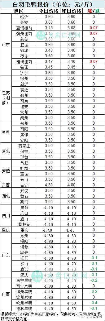 1:今晚北方分割鸭区域报价整体稳定,山东棚前价格上调0.05元/斤。到场均价在3.60-3.65之间。