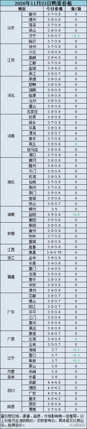 2020年11月23日淘汰蛋鸭价格参考值:活禽6.5-7.0元/斤、屠宰5.5-6.0元/斤。受肉鸭活禽价格下跌影响叠加淘鸭增多种鸭淘汰乱市,淘汰蛋鸭持续弱势震荡,走货较慢。