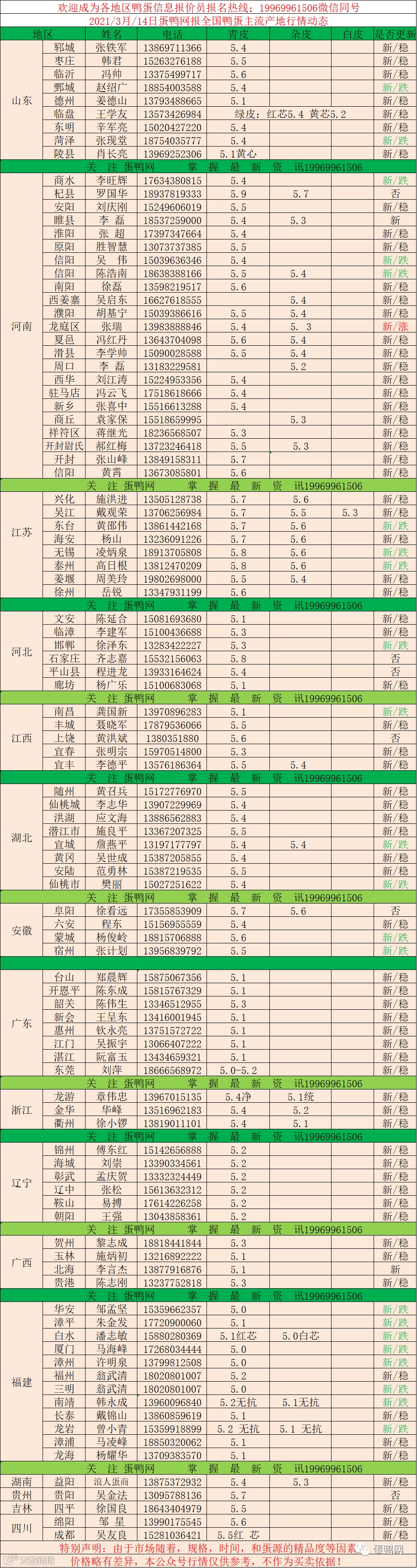 2021年3月14日鲜鸭蛋价格:初产至大蛋5.2(鸭蛋价格仅供参考)。